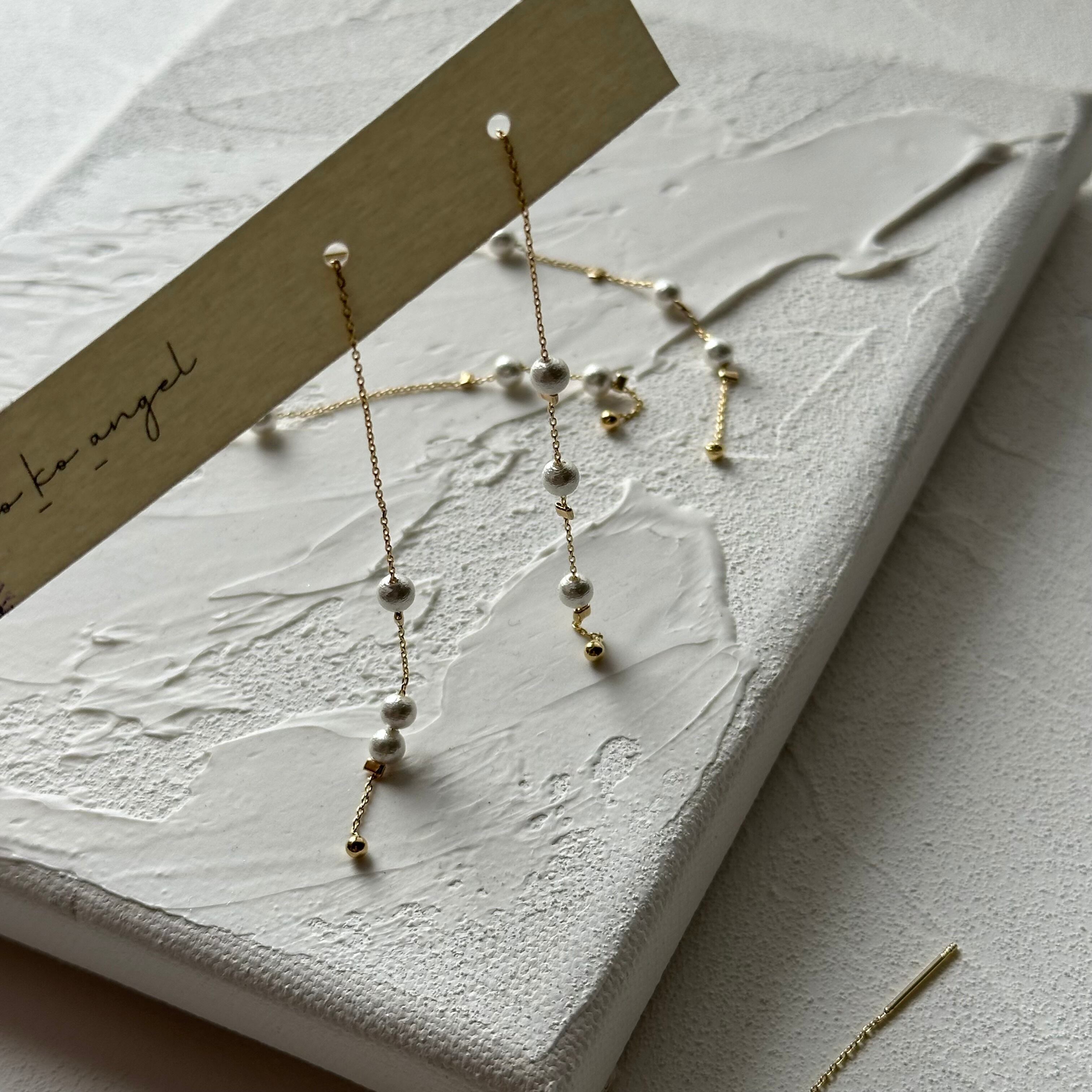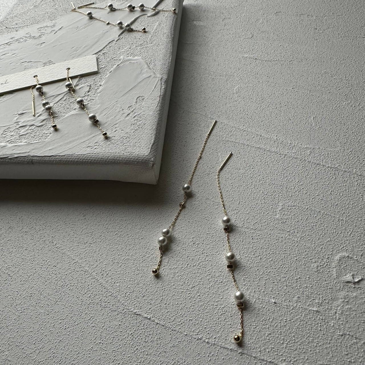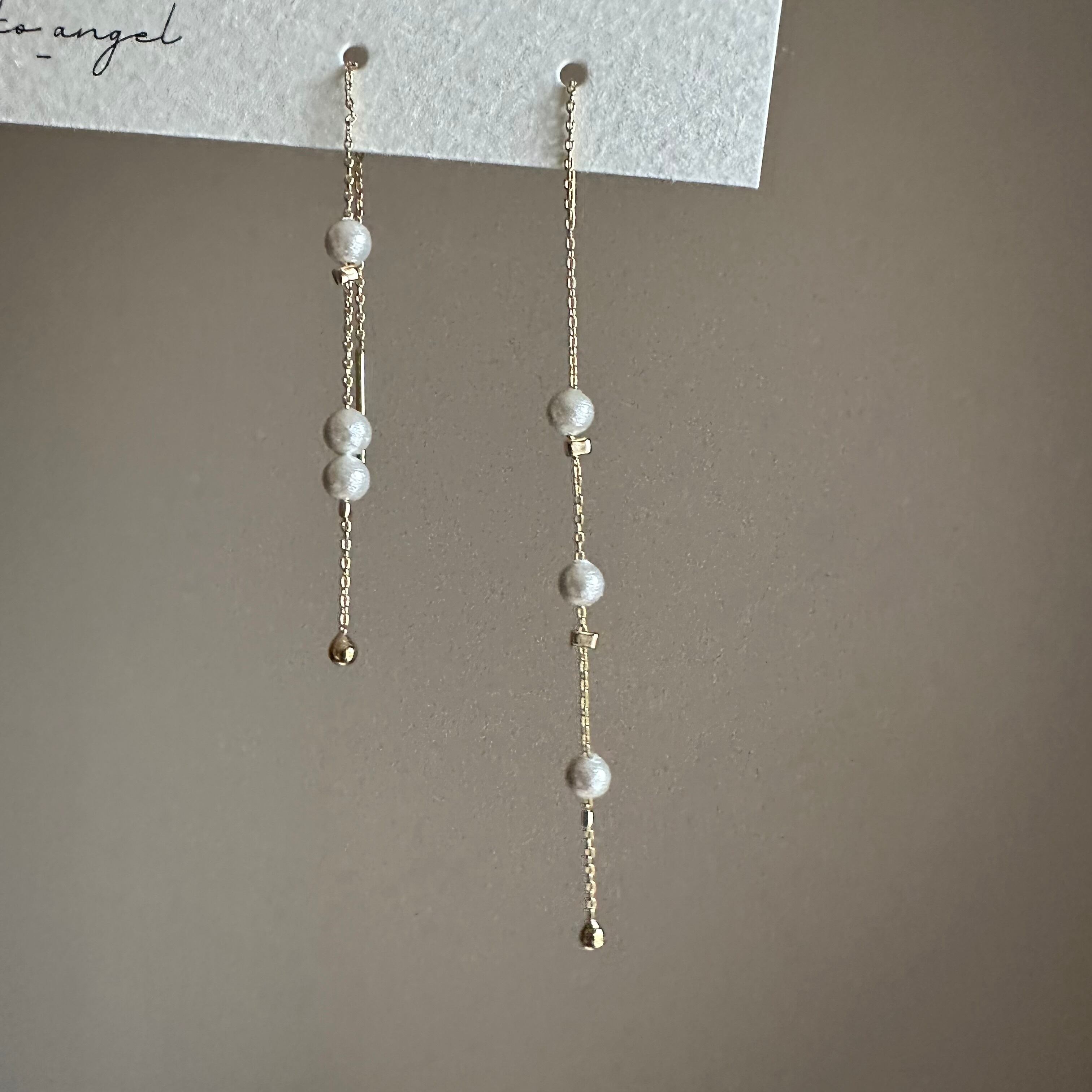 細かな編み目のチェーンに小さなホワイトコットンパールを動きがでるよう左右非対称にあしらいました